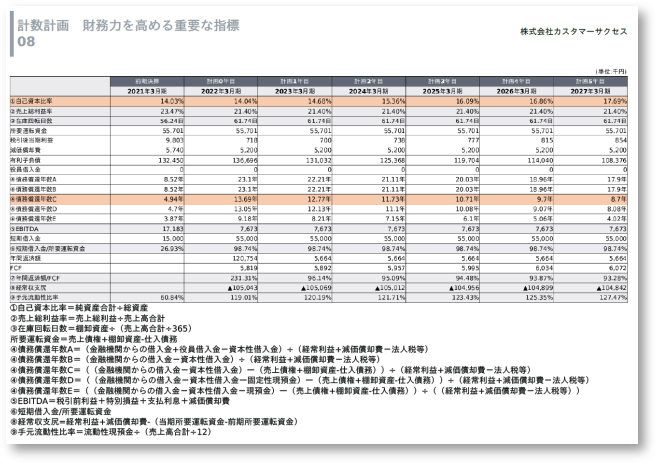 - 「債務償還年数」と「自己資本比率」を鑑みた計画